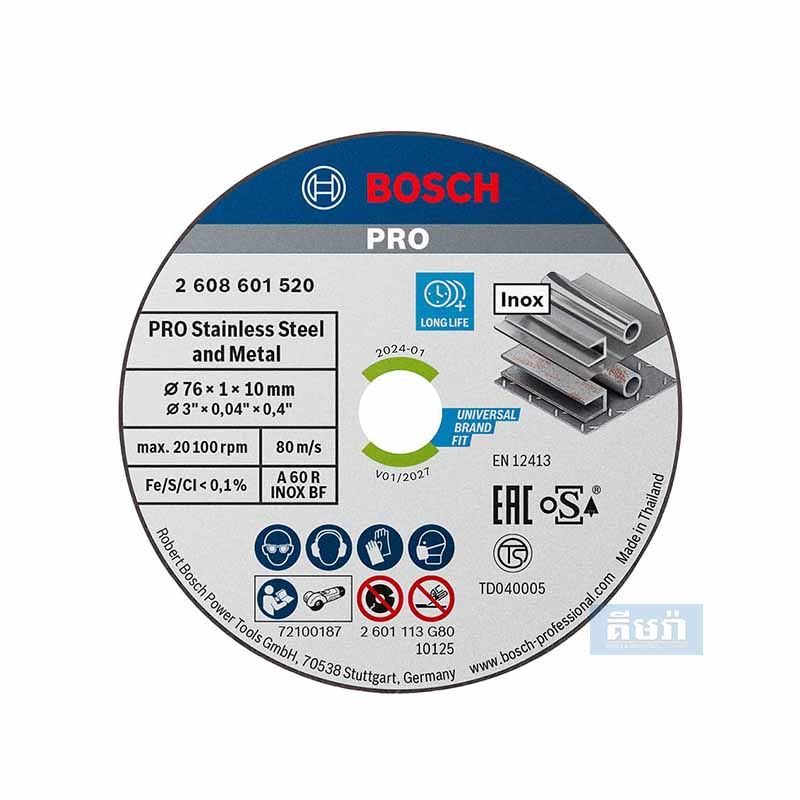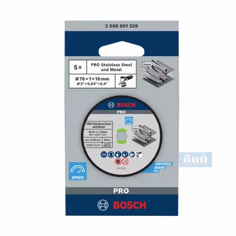 A 5 pack of 76 mm Expert INOX cutting discs from Bosch for cutting stainless steel. Designed for use with the Bosch GWS 10.8-76 V-EC professional cordless grinder with 10 mm fitting.